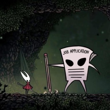 [alt text: an edited screenshot from Hollow Knight Silksong. The main character Hornet is facing a large enemy, which appears to be an anthropomorphic piece of paper wielding a pencil as a weapon. The piece of paper has the words “Job Application” written on the top.]
